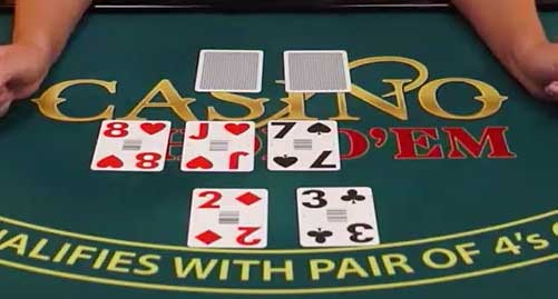 In Casino Hold’em, only two hands are dealt. The dealer and player positions both get two cards. The 5 community cards are dealt and the side (Player or Dealer) with the better poker hand wins.