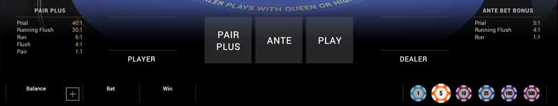 - Play – If he wants to play the hand he either hits the Play button, which will place an additional bet equal to the ante. If the player has just played the Pairs Plus side bet, no further actions are needed, as the bet is in play as soon as it’s made.